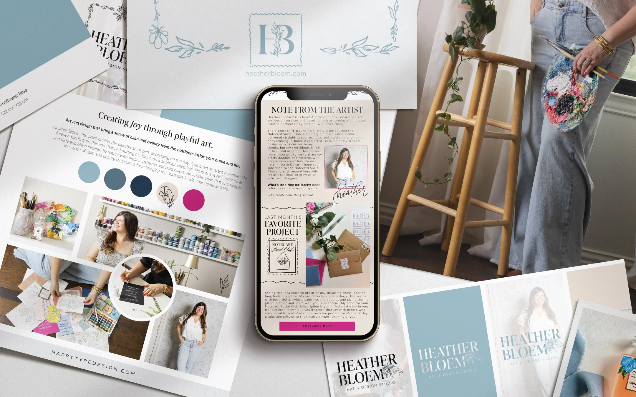 SERVICES & SUCCESS: Entering a new season of growth, Heather Bloem hired Happy Type to refresh the artist’s brand style to a more timeless yet playful look including outlining brand standards and implementing in everyday marketing assets. Our team is also assisting with bringing a backlog of product ideas to life via product design, print sourcing, product launch strategy and marketing assets for email and social media.